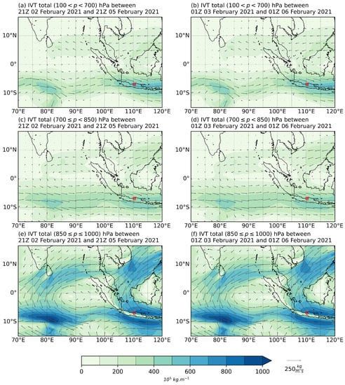 Time-integrated IVT for 72 h prior to the period of maximum precipitation events: (a,c,e) 21Z 02 to 21Z 05 February 2021 and (b,d,f) 00Z 03 to 00Z 06 February 2021 over three different layers: (a,b) () hPa, (c,d) () hPa, and (e,f) () hPa. The location of Semarang is denoted by a red box.