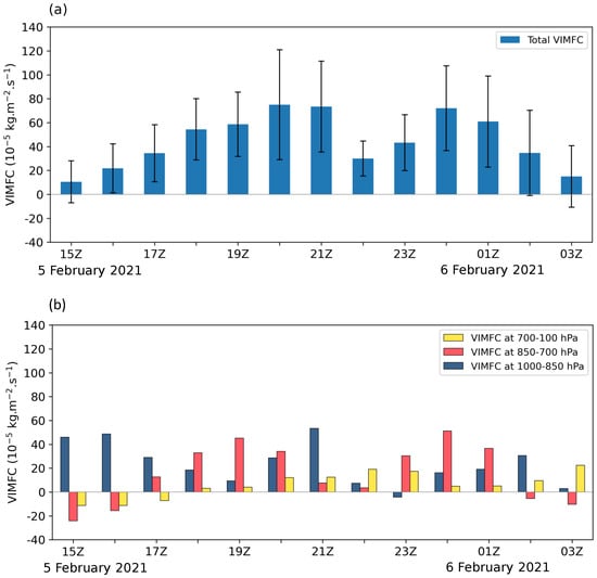 Hourly time evolution of the vertically integrated moisture flux convergence (VIMFC, 10−5 kg·m−2.s−1) over the Greater Semarang area (6.625 S–7.125 S and 110.125 E–110.625 E) calculated for (a) the total atmospheric columns with its standard deviation, and (b) the three layers defined in the study; that is, upper-layer () hPa; middle-layer () hPa; and bottom-layer () hPa during 15Z 5 February 2021 to 03Z 6 February 2021.