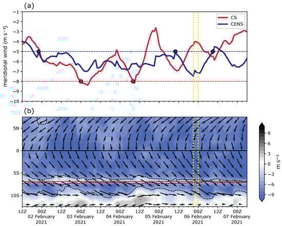 (a) Time series of cross equatorial northerly surge (CENS) (blue line) and cold surge (CS) (red line), the horizontal-dashed line indicates the threshold of an activated mode of CENS and CS. (b) Time-latitude of 925 hPa horizontal wind magnitude and direction (arrows), contour-fill represents meridional wind and the dotted line shows the value of 5 m/s, the red line marks the latitude of Semarang coastline, the vertical yellow line marks the rainfall peaks. Both (a) and (b) x-axis span from 12Z 2 February to 03Z 7 February 2021.