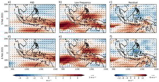 Daily evolution of 850 hPa zonal wind (color shading) and total wind anomalies (vector) anomalies during the Semarang flood event on 5 February 2021 (a–c) and on 6 February 2021 (d–f). Wind anomalies filtered for (a,d) Madden–Julian oscillation (MJO), (b,e) the low-frequency oscillation (>120 days), and (c,f) residuals (total–(MJO + low frequency)). Note that the amplitude used for the residuals is different from MJO and low-frequency variability.
