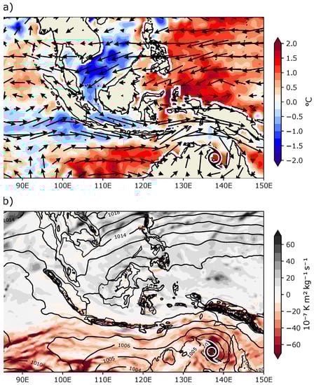 The influence of the CENS, low-frequency variability and tropical depression on the moisture transport is consistent with the background SST condition during the period of extreme rainfall in Semarang (Figure 9a). Colder SST anomalies were observed in the South China Sea region lower to −2 C and the Indian Ocean region to the west of Java Island lower to −1 C. Meanwhile, positive anomalies are seen in the seas of the Maritime Continent to the east and the south of Java, with an anomaly of 2 C spreading extensively. The meridional SST gradient between the South China Sea region and Java drive the development of CENS. Meanwhile, the zonal SST gradient between the Indian Ocean and West Pacific warm pool drive the zonal circulation that is associated with the low-frequency variability (La Nina). In addition, the formation of a tropical depression over the North of Australia is consistent with the high positive potential vorticity and low-pressure anomalies (Figure 9b). This low-pressure system is associated with the tropical depression and is also likely to be responsible for the strengthening zonal wind from the Indian Ocean towards Semarang.