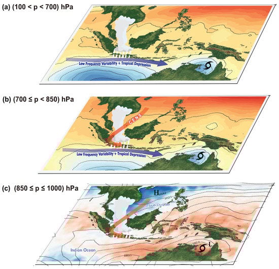 These main results are summarized in a conceptual diagram in Figure 10. This diagram shows that the influence of CENS is dominant at the bottom/near surface layer () hPa and partly at the middle layer () hPa. The effects of La Nina transport moisture from the Indian Ocean to Semarang, mainly in the upper layer () hPa. In addition, a low pressure located in the north of Australia was associated with a tropical depression and strengthened the westerly winds to supply the moisture in the MCS development over the region.