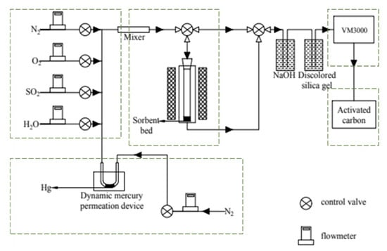 The gas feeding system chiefly consisted of sources of O2, N2, NO, and SO2 with a mass flow controller for control of the flow rate. The simulated flue gas was mostly composed of the 4 gases listed above, with proportions chosen to simulate the components of flue gas. The Hg0 generation system used a Dynacalibrator Model 500 mercury penetration tube. The steady Hg0 generation system also consisted of a water bath, N2 as a carrier gas with a flow rate of 300 mL/min, a U-shaped tube for Hg0 penetration, and a tube holder. The initial Hg0 concentration was maintained at 50µg/m3 by controlling the temperature of the water bath at 60 °C. The main part of the adsorption reaction system was a vertical fixed bed, which mainly consisted of an electric furnace and an annular quartz tube reactor. The diameter of the inner tube was 14 mm with a quartz sieve plate. During the reactions, the sorbents were placed in the plate covered by quartz wool to inhibit the blowing of the sorbent during gas feeding. During the experiment, the Hg0 vapor passed through the sorbents, and the Hg0 adsorption reactions occurred in the gas–solid reaction system. A VM3000 from Mercury Instruments in Germany was used for Hg0 online monitoring, and the detection precision was about 0.1 μg/m3. The exhaust first passed through activated carbon to dispose of the remaining Hg0 before it was sucked into a vent.