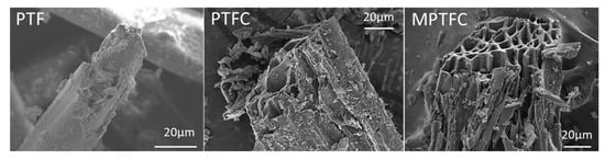 The SEM observations for PTF, PTFC, and MPTFC are shown in Figure 2. It can be seen that the original PTF has a hollow fiber shape with compact layer structures, and the diameter of the fiber is about 20 μm. Both the surface and the inner layer of the fiber seem to be smooth and without pores. However, the micro-morphology of PTFC is very different in comparison to that of PTF. The hollow fiber shape shifts to organized directional tubular columns. A single tubular structure is about 10 μm in diameter, while the column is about 50 μm in diameter. Some cracks and pores can also be observed on the surface of the tubular structure. Those alterations in morphology are highly suspected to result from the release of volatiles during pyrolysis. The violent gas explosion from the inside of the PTF caused the expansion of the layer structures, thus producing the organized tubular columns. Those changes benefited PTFC in terms of adsorption because of the relatively higher number of porous structures. The micro-morphology of MPTFC is almost the same as that of PTFC, which indicates that the FeCl3 modifications only functionalized the surface of the material.