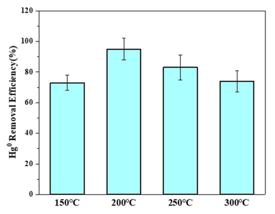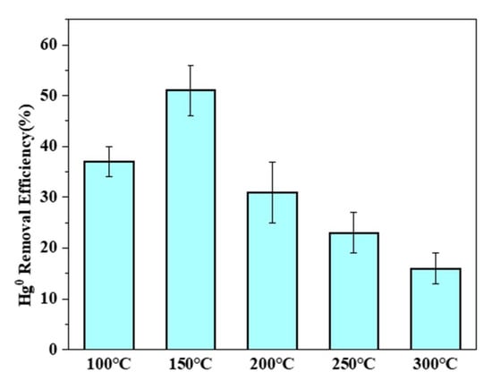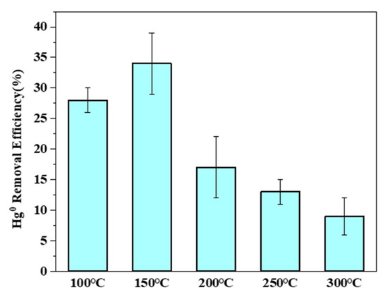 To evaluate the effects of temperature on the performance efficiency of PTFC for Hg0 removal, we conducted the Hg0 adsorption experiments at different temperatures in the N2 ambiance. The Hg0 removal efficiencies as a function of temperature are shown in Figure 3. It can be seen that the optimal temperature for Hg0 adsorption by PTFC was 150 °C; the efficiency was greater than 50%. As the temperature increased, the Hg0 removal efficiency of PTFC decreased, falling to 16% when the temperature increased to 300 °C. The results indicate that physical adsorption may dominate the Hg0 adsorption of PTFC in N2 +8% O2 ambiance. Hg0 was physically adsorbed on the surface of the PTFC and then diffused in the tubular columns in the gas flow fields. The binding force between the Hg0 and the PTFC was weak, thus, it was desorbed as temperature increased as a result of the intensification of molecular motion.