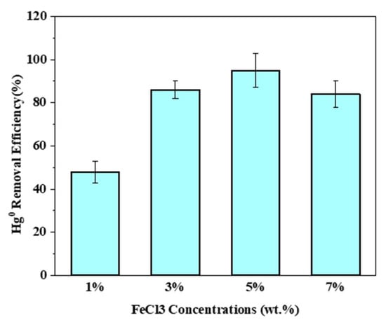 The FeCl3 precursor we used for the PTFC modifications was prepared in a concentration gradient from 1% (wt.%) to 7% (wt.%) with intervals of 2% (wt.%). The series of MPTFCs with different levels of FeCl3 modifications was tested for Hg0 adsorption capability at 200 °C in N2 + 8%O2 ambiance. The Hg0 removal efficiencies for all MPTFCs are shown in Figure 5.