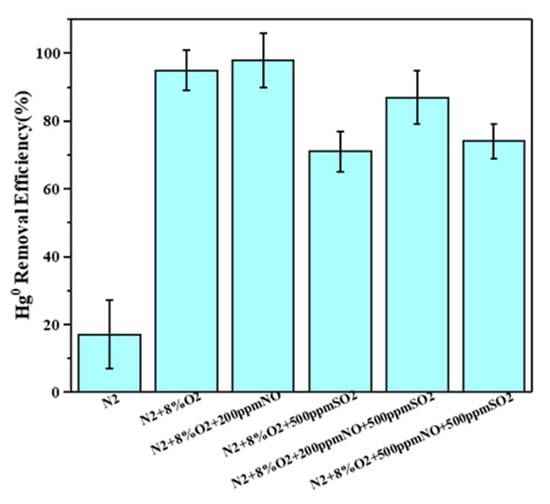 In order to evaluate the impact of the flue gas components on Hg0 adsorption of MPTFC, certain concentrations of NO and SO2 were introduced into the reaction system in the experiments; the results are shown in Figure 7. It can be observed that the gas components had some impact on Hg0 removal capability. Specifically, Hg0 removal efficiency in N2 was around 17%, whereas Hg0 removal efficiency was boosted to around 95% when O2 was introduced into the reaction system. When 200 ppm NO was added into the reaction system, Hg0 removal efficiency increased to 98%. However, Hg0 removal efficiency decreased to 71% when 500 ppm SO2 was added into the reaction system, indicating the inhibiting effects of the SO2 injection. When both NO and SO2 were present in the reaction system, an improvement in Hg0 adsorption capability was observed, and the Hg0 removal efficiency increased to 87% in comparison with the SO2-only ambiance. It can also be observed that an increase of NO in the flue gas from 200 ppm to 500 ppm inhibited Hg0 adsorption capability slightly, which was probably due to competitive adsorption between NO and Hg0 on the surface of the MPTFC. When NO was at a low concentration, the presence of NO promoted Hg0 adsorption capability. This result was probably because the NO adsorbed on the surface formed NO2 and NO, and those activated species reacted with Hg0 to form HgO and Hg (NO3)2.