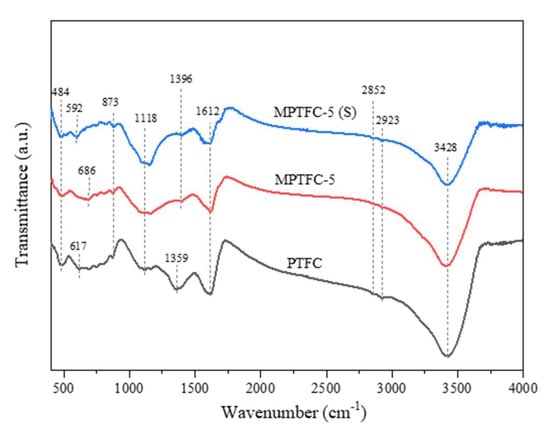 FTIR spectrums of PTFC, MPTFC, and MPTFC(S).