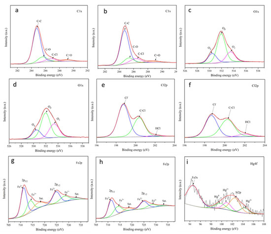 XPS spectrums of C 1s, O 1s, Cl 2p, Cl 2p, and Hg 4f of MPTFCs. (a,b) The C 1s spectrums for MPTFC before (a) and after (b) the Hg0 adsorption experiments; (c,d) The O 1s spectrums for MPTFC before (c) and after (d) the Hg0 adsorption experiments; (e,f) The Cl 2p spectrums before (e) and after (f) the reactions; (g,h) The Fe 2p spectrums of MPTFC before (g) and after (h) the reactions; (i) The Hg 4f spectrums for spent MPTFC.