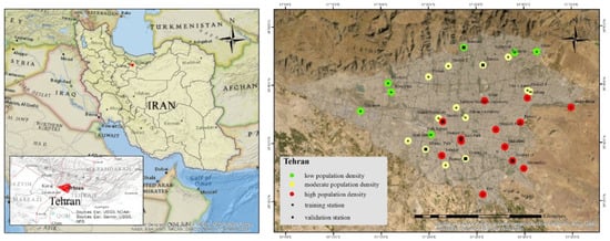 The study area (the Middle Eastern megacity of Tehran) in the left panel and the locations of 33 ambient monitoring stations (26 training and seven validation stations) in the right panel.