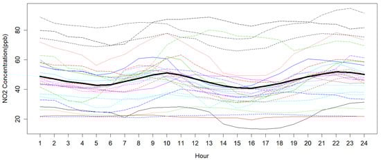 The smoothed diurnal curves of in 26 model-training stations are presented in Figure 2. They show that the long-term yearly average of concentrations varied between 13.28 to 91.46 ppb during a diurnal time period. Moreover, it highlights the heterogeneity in the values and shapes of the diurnal curves.