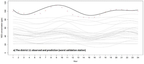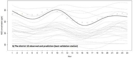 Figure 4 presents the prediction of the diurnal curve at two validation-monitoring stations with the worse and best prediction based on the correlation coefficient between the observed and predicted values. It shows that the predicted values were consistent with the observed data, and the behavior of the predicted curves was similar to the corresponding smoothed curves.