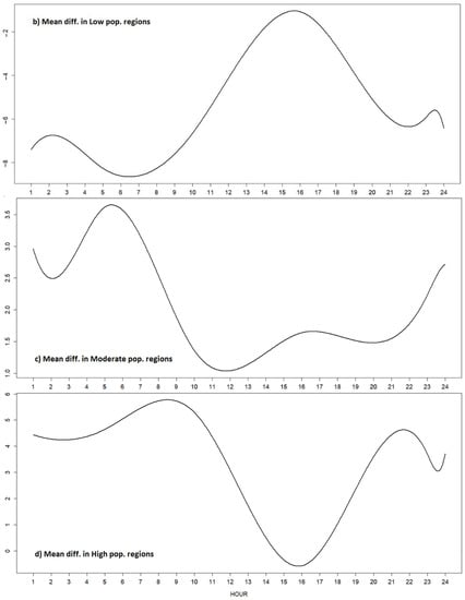 To achieve better interpretability, the predictions of mean diurnal curves in areas with low, moderate, and high population densities are depicted in Figure 6. According to this figure, the shapes of the diurnal curves were different at most times in areas with different population densities. The values of the concentrations in areas with low population densities were notably lower than areas with moderate and high population densities with the exception of times around 4 p.m. The concentrations were slightly lower in areas with moderate population density with respect to areas with high population density, but with the exception of times between 1:25 p.m. and 6:24 p.m. The absolute minimum of the mean diurnal curve in areas with a low population density was around 5 a.m., which was a bit later than the time of the local minimums of the mean diurnal curves in the moderate and high population densities.