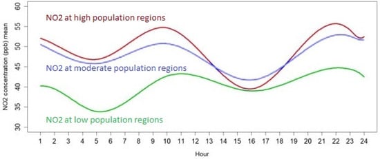 We assigned monitoring stations into three groups based on their region’s population density (high, moderate, and low) and compared the mean diurnal curves of between these three areas using a functional analysis of variance (FANOVA) [].