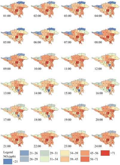 The predicted maps of concentrations at the starting time point of each hour, from 1 to 24, are presented in Figure 7. According to the predicted maps, the central and east parts of Tehran (i.e., districts 7, 8, 10, 11,13,14,15, and 20 had the highest long-term concentration of (upper 45 ppb) for almost all days). The north and northwest districts of Tehran in general have the lowest concentrations, which were almost lower than 34 ppb. Interestingly, this matrix of the predicted maps revealed the existence of different patterns of the changes during the day. For example, the north and northwest parts had their cleanest conditions approximately the hours from 4 a.m. to 6 a.m., while it seems that the rest of Tehran had less polluted conditions from midday to 5 p.m.