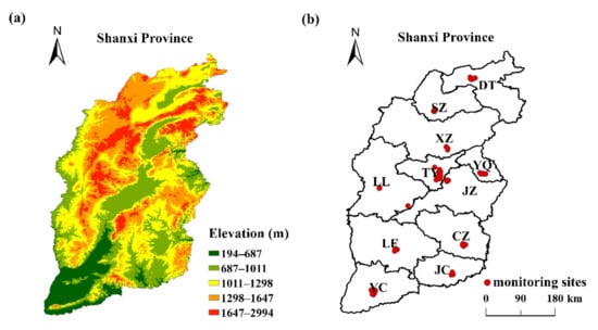 The terrain of Shanxi Province (a) and the geographical locations of the prefecture cities in it with the monitoring stations being marked with red dots (b).