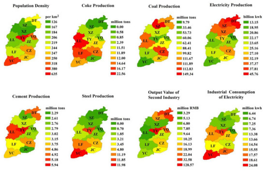The spatial distribution of population and various industrial development indicators in Shanxi Province. The data are from Shanxi Statistical Yearbook-2018 [26].
