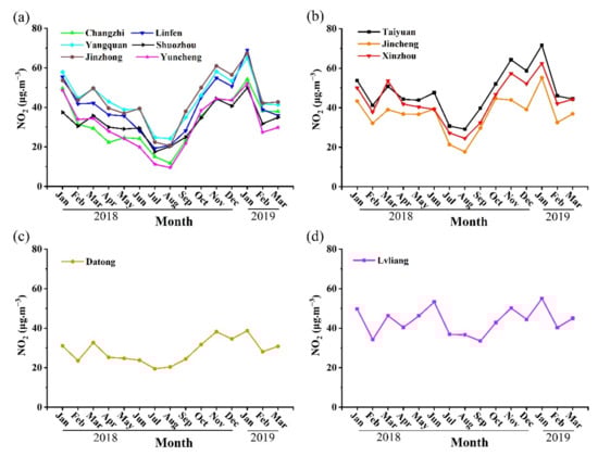 Annual variations of monthly mean concentrations of NO2 in 11 prefecture cities in Shanxi Province. (a) first type; (b) second type; (c) third type; (d) fourth type.