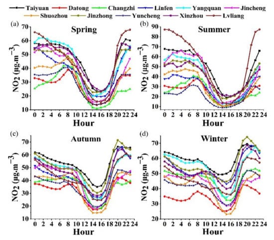 Diurnal variations of hourly mean concentrations of NO2 in 11 prefecture cities in Shanxi Province. (a) spring; (b) summer; (c) autumn; (d) winter.