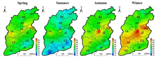 The prevailing wind is northwest in the northern part of Shanxi, northeast in the central region, southwest and southeast in the southern part. CZ and LL had the highest annual average wind speeds, being 3.15 m/s and 2.81 m/s, respectively. The average annual wind speeds in LF (1.47 m/s) and SZ (1.62 m/s) and LL (1.98 m/s) were smaller than 2 m/s, while the speeds in the rest cities were in the range of 2.03 to 2.43 m/s. For the seasonal change, the wind speed at each studied city was the largest in spring, while had no obvious difference in other seasons (Table S1).