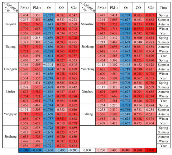 NO2 is considered to be an important precursor of atmospheric O3 and PM2.5. In all of the cities, NO2 showed a strong negative correlation with O3 (Figure 7). Wang et al. (2019) found that most northern cities in China have negative correlations between NO2 and O3 but positive correlations in southern cities [24], indicating that NO2 played different roles in the generation of O3 in different regions. Although O3 pollution mainly happened in summer with NO2 being an important combustion improver, no significant seasonal difference was observed about their correlation coefficient (Figure 7). Some studies found that areas with higher NO2 concentrations tend to have lower O3 concentration in southeast China [20]. However, we cannot find the similar phenomenon in Shanxi, even in summer, which maybe attribute to variable industries, terrain, and meteorological conditions for the cities in it. From Figure S2, we can see that the places with higher O3 concentration are mainly concentrated in the south part of Shanxi with higher temperature and stronger solar radiation, while higher NO2 concentration are mainly concentrated in the central part of Shanxi with larger industrial emissions including coking production, electricity production and cement production etc. as shown in Figure 2. Similar spatial distribution between SO2 and NO2 can also illustrate this point. However, TY was an exception, where the concentrations of NO2 and O3 were both higher than its neighboring areas, but the concentration of SO2 was lower than the latter. The main reason is that TY has a very high population density (Figure 2) and car ownership, traffic should have a large contribution to NO2 pollution, which then resulted in heavy O3 pollution. In LL, which has a higher altitude, complex mountainous terrain and relatively lower air temperature, the concentration of O3 was low though the concentration of NO2 was high.