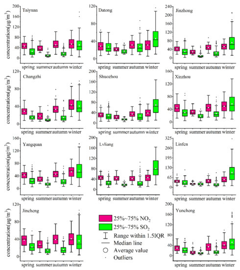 Box plots of seasonal NO2 and SO2 concentrations in 11 prefecture cities in Shanxi province.