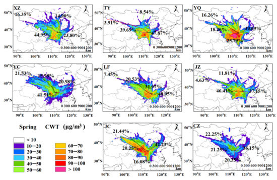 In spring (Figure 9 and Figure S4), LL, YQ, JC, TY, LF and JZ were influenced by heavy input of NO2, while central-north Shaanxi and central-south Shanxi were identified by CWT as the main source areas. The areas around Erdos in Inner Mongolia, Yinchuan in Qinghai, northern Henan and south of Shijiazhuang in Hebei also contributed to the NO2 pollution of the above cities. The contribution of central-south Shanxi to NO2 reached above 100 μg/m3. Air masses from the areas around Huanghe River on the Shanxi-Shaanxi border had a certain contribution to NO2 in SZ and XZ.