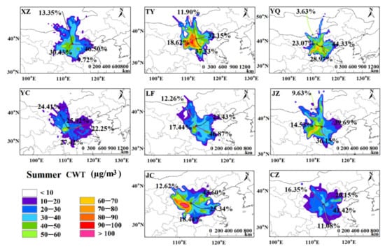 CWT maps for NO2 by mass concentration (μg/m3) in summer in the cities having over-standard days.