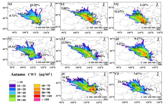 In autumn (Figure 11 and Figure S6), local Shanxi, especially the central and southern parts became the main source areas, followed by northern Henan and southern Hebei. The most affected cities included YQ, TY, JC, LL, JZ and XZ. The areas around Huhhot in Inner Mongolia were also the important source areas for some cities, such as YQ, TY and JZ.