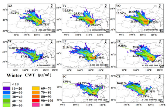 In winter (Figure 12 and Figure S7), NO2 concentrations in TY, YQ, JZ, XZ, LF and CZ were influenced markedly by air masses incoming from their surrounding areas. The main source areas were within Shanxi, while the air masses originating from the adjacent regions in the surrounding provinces such as Henan, Hebei and Inner Mongolia also had some contributions. Northern Shaanxi had non-ignorable influence to the NO2 pollution in TY.