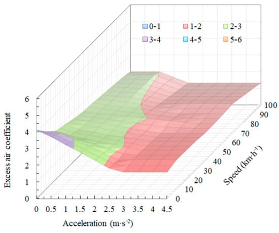 Figure 2 shows the schematic map of excess air coefficients for the two tested HDDTs. The vehicle speed ranged from 0 to 100 km∙h−1 with an interval of 5 km∙h−1, and vehicle acceleration ranged from 0 to 4.5 m∙s−2 with an interval of 0.5 m∙s−2. The surface plots of excess air coefficients show that the excess air coefficient decreased with the increased fuel injection due to the increased engine load with the increase in the vehicle speed or acceleration.