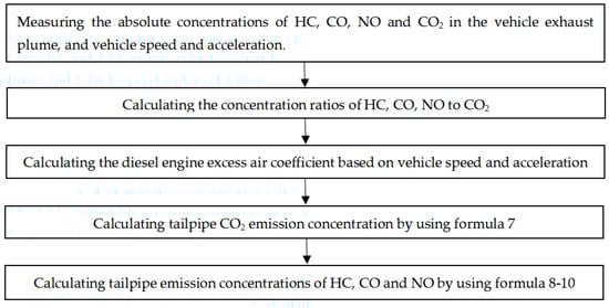 Although vehicle emissions are influenced by many factors, it is practical to determine the engine excess air coefficients based on the driving dynamics of diesel vehicles. In this way, the excess air coefficient of the diesel vehicle engine under test conditions can be obtained, and the concentration ratios of HC, CO, NO and CO2 in the exhaust plume can be measured by RSD; therefore, diesel vehicle tailpipe emission concentrations of HC, CO, NO and CO2 can be calculated and used to evaluate diesel vehicle emission levels. The calculation procedure for the remote sensing of tailpipe emission concentrations from diesel vehicles is depicted in Figure 3.