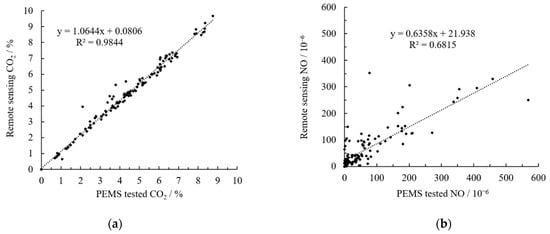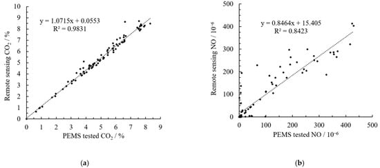 In this study, the inversion calculation formula defined by Equation (7) was utilized to calculate the remote sensing results of CO2 emission from heavy diesel vehicles, and was validated by PEMS-tested CO2 emissions of heavy diesel vehicles. Furthermore, the NO concentration was calculated based on the concentration ratio of NO to CO2, and was also compared with PEMS-tested NO emission of heavy diesel vehicles.