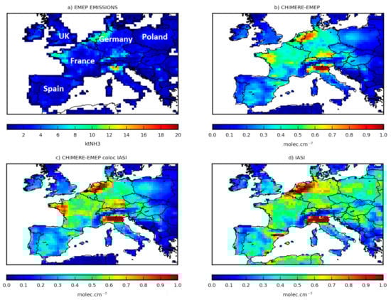 (a) Mean EMEP NH3 emissions, in ktNH3, and mean average of (b) the simulated CHIMERE-EMEP NH3VCD, (c) the CHIMERE-EMEP-colocIASI NH3 VCD and (d) the IASI-v3R observations, over the continental domain, in molec.cm−2, for the period 2008–2015.