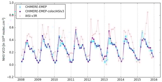 The simulated CHIMERE-EMEP and CHIMERE-EMEP-colocIASI NH3 VCDs show a similar monthly variability (Figure 2). CHIMERE-EMEP, CHIMERE-EMEP-colocIASI and IASI-v3R, NH3 VCD also present similar seasonal cycles (Figure 2), the latter ones presenting a temporal correlation of 0.59 from 2008 to 2015. Maximums are seen in spring, when ammonia emissions are enhanced due to mineral fertilizer use in accordance with crop requirements [23,32,46,47,48], and a minimum in winter. However, it should be noted that IASI often shows a strong peak in summer in addition to the spring peak, whereas CHIMERE only shows a slight peak in summer some years (e.g., in 2009, in 2011). This result could point to a misrepresentation of the temporal profiles by GENEMIS, to missing emission sources during summertime, either due to more than expected fertilizer use in summertime or to increased volatilization from soils (not including in CHIMERE). Marais et al. [43], estimating the UK ammonia emission from satellite observations including IASI, consistently showed a summer peak associated with dairy cattle farming.