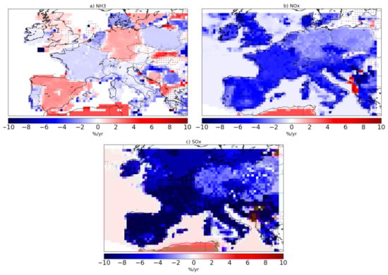 Eight-year trends of (a) NH3, (b) NOx, and (c) SOx emissions in the EMEP inventory. Pixels with insignificant trend, with a p-value higher than 0.05, are shown with a cross symbol. Units are in%/yr.