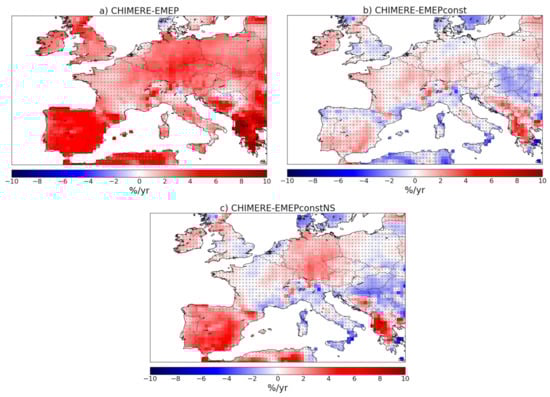 Eight-year trends of NH3 VCD (a) with the CHIMERE-EMEP simulations, (b) simulated by CHIMERE with all anthropogenic EMEP emissions kept constant at the 2008 levels, and (c) simulated by CHIMERE with NOx and SOx anthropogenic EMEP emissions kept constant at the 2008 levels, over Europe for the period 2008–2015. Pixels with insignificant trend, with a p-value higher than 0.05, are shown with a cross symbol. Units are in %/yr.