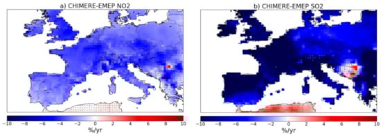 Eight-year trends of (a) NO2VCD and (b) SO2VCD, simulated by CHIMERE with the set-up described in Section 2.1, for the period 2008–2015. Pixels with insignificant trend are shown with a cross symbol. Units are in %/yr.