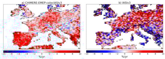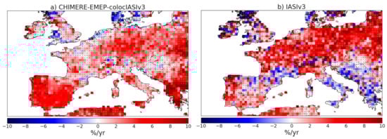 Eight-year trends of NH3 VCD (a) simulated by CHIMERE-EMEP-colocIASI and (b) observed by IASI-v3R observation, taking into account the months of March, April, and May in spring and the months of June, July, and August in summer only. Pixels with insignificant trend, with a p-value higher than 0.05, are shown with a cross symbol. Units are in %/yr.