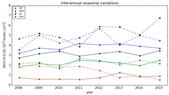 Inter-annual seasonal variations of NH3 VCD, for the months of December, January, and February DJF in winter (in red), for the months of March, April, and May MAM in spring (in blue), for the months of June, July, and August JJA in summer (in black), for the months of September, October, and November SON in autumn (in green), from 2008 to 2015, in 1015molec.cm−2. Solid lines represent the simulated NH3 VCDs whereas the dotted lines represent the observed NH3 IASI VCDs.