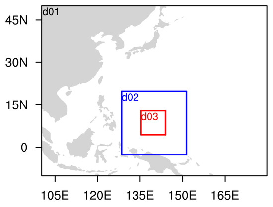 The model is configured with three domains of horizontal resolutions of 18, 6, and 2 km, with 36 vertical levels. The first domain (d01) has 462 × 396 grids, the second domain (d02) has 399 × 399 grids, and the third domain (d03) has 450 × 450 grids. The second and third domains automatically move, following the movement of the storm center via an automatic vortex-following algorithm. Figure 1 shows the geographic locations of the three domains.