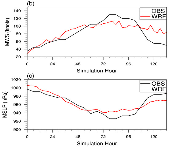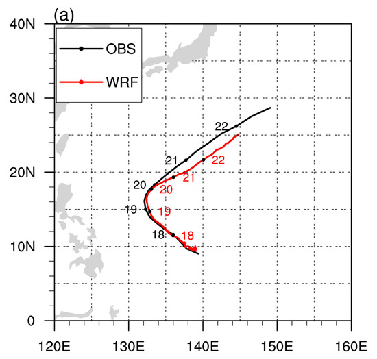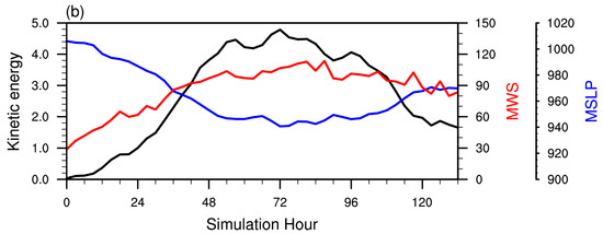 The simulated TC track (red) is shown in Figure 2a. As one can see, the model successfully simulates the movement of TC Yutu. Initially, Yutu moves northwestward, and then turn northeastward in a later stage.