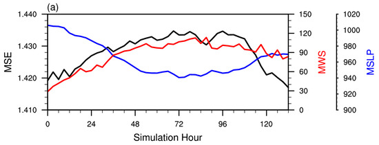 Temporal evolution of (a) column-integrated MSE (black; 1011 J m−2) and (b) column-integrated kinetic energy (black; 105 J m−2) integrated from surface to 18 km within a radius of 150 km. For comparison, the TC MWS (red; knots) and MSLP (blue; hPa) are also shown.