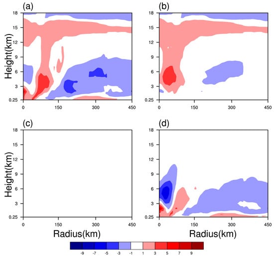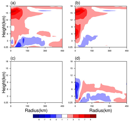 Height-radial cross-sections of the change of (a) MSE, (b) , (c) , and (d) from hour 24 to hour 48 (units: 103 J).
