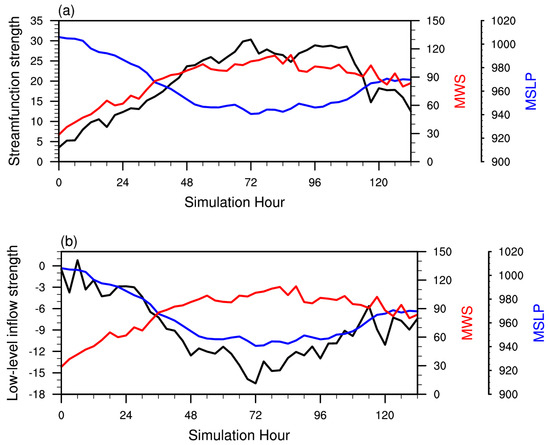 Temporal evolutions of (a) the secondary-circulation stream function index (black; 109 s−1), (b) the secondary-circulation low-level inflow index (black; m s−1, negative represents inflow), the MWS (red; knots), and the MSLP (blue; hPa).