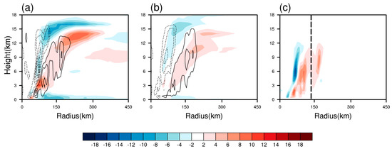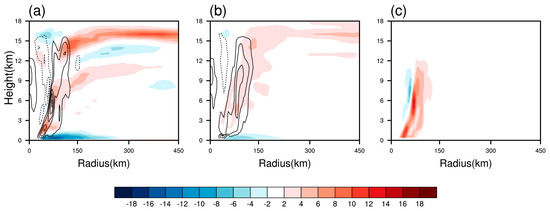 Height-radial cross-sections of the change of azimuthal-mean radial wind (shaded; m s−1) and vertical velocity (contour; m s−1) from hour 24 to hour 48 (i.e., hour 48 minus hour 24) derived from (a) the WRF simulation and (b) the SE equation diagnoses and (c) the change of the diabatic heating field (10−3 K s−1) derived from the WRF model from hour 48 to hour 72.