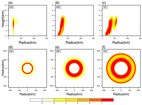 Height-radial cross-sections of azimuthal-mean diabatic heating (10−3 K s−1) at (a) hour 24, (b) hour 48, and (c) hour 72. Horizontal distributions of the azimuthal-mean diabatic heating field averaged between 6 km to 8 km at (d) hour 24, (e) hour 48, and (f) hour 72, respectively.