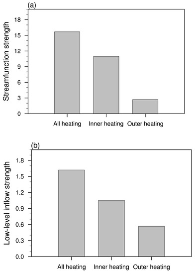 To reveal the relative importance of the inner and outer heating anomalies in contributing to the growth of the secondary circulation during hour 48 to hour 72, we diagnosed the SE equation with separately specified inner and outer heating forcing. The diagnosed radial wind and vertical velocity patterns (Figure 8b) when both the inner and outer heating fields are considered resemble well those directly obtained from the WRF simulation (Figure 8a), with a weaker intensity.