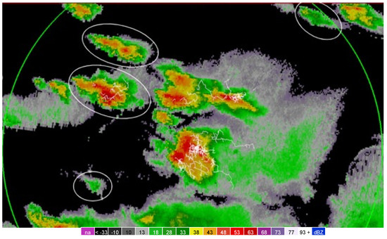 Archived radar images from the University Corporation for Atmospheric Research were used to determine dates where isolated cells (white circles; Figure 1) were present on days with lightning. Using similar criteria as [5], we defined isolation as a cell being separated by composite ZH < 15 dBZ from nearby cells. All convective cells in this study had to remain isolated through lightning cessation and storm dissipation. A total of 23 isolated storms were selected during the 2015–2017 warm seasons.