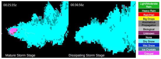 The Rapid Refresh model (RAP) [28] data were used in this study and had to be converted to the proper format using the NetCDF algorithm [26]. To finalize processing, the near storm environment algorithm (nse) [26] was run to obtain RAP temperature level altitudes (i.e., 0 °C, −5 °C, −10 °C, −15 °C, and −20 °C) at the time of each convective cell. Running the merging algorithm (w2merger) [26] then allowed WDSS−II to blend radar data (~1 km horizontal and vertical grid spacing) between KLWX and KDOX using an exponential weighting function based on distance to each radar. The merging algorithm also decreased the time interval from 5 min to 1 min as each elevation scan is processed. The WDSS−II software does not wait for full radar scans to be completed. The merging algorithm was run alongside the simulator algorithm (w2simulator) [26] to allow chronological files to be processed and viewed within WDSS−II. We also ran the hydrometeor classification algorithm (HCA; w2dualpol) [26], which is based on the algorithm developed by J. Krause at the National Severe Storms Laboratory and described by [29,30,31]. The algorithm uses polarimetric base products, reflectivity information, as well as texture products along the radar beam. The HCA used here identifies hydrometeor types and assigns a particle identification value to the dominant or majority quantity within each radar range gate of a volume scan [32]. As with the other radar parameters, WDSS−II interpolates the HCA categories to ~1 km horizontal and vertical grid spacing. The HCA category at a location is the particle identification value from the closest radar (not a weighting function based on distance to each radar). This product was used to determine the presence of graupel in the mixed phase region of a storm (Figure 3).